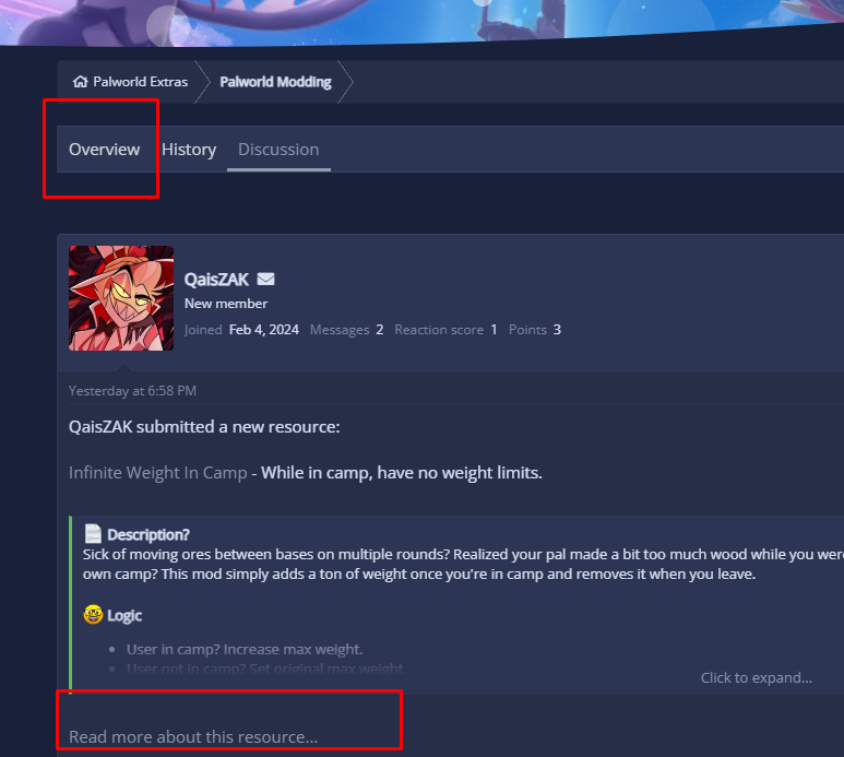 Sick of moving ores between bases on multiple rounds? Realized your pal made a bit too much wood while you were gone and now you can't transfer it all? Or simply want to have more freedom in your own camp? This mod simply adds a ton of weight once you're in camp and removes it when you leave.